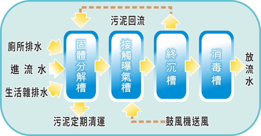 本設施分為三槽,污水進入固液分離槽後,固體物質會浮於槽頂或沉入槽底,以降低